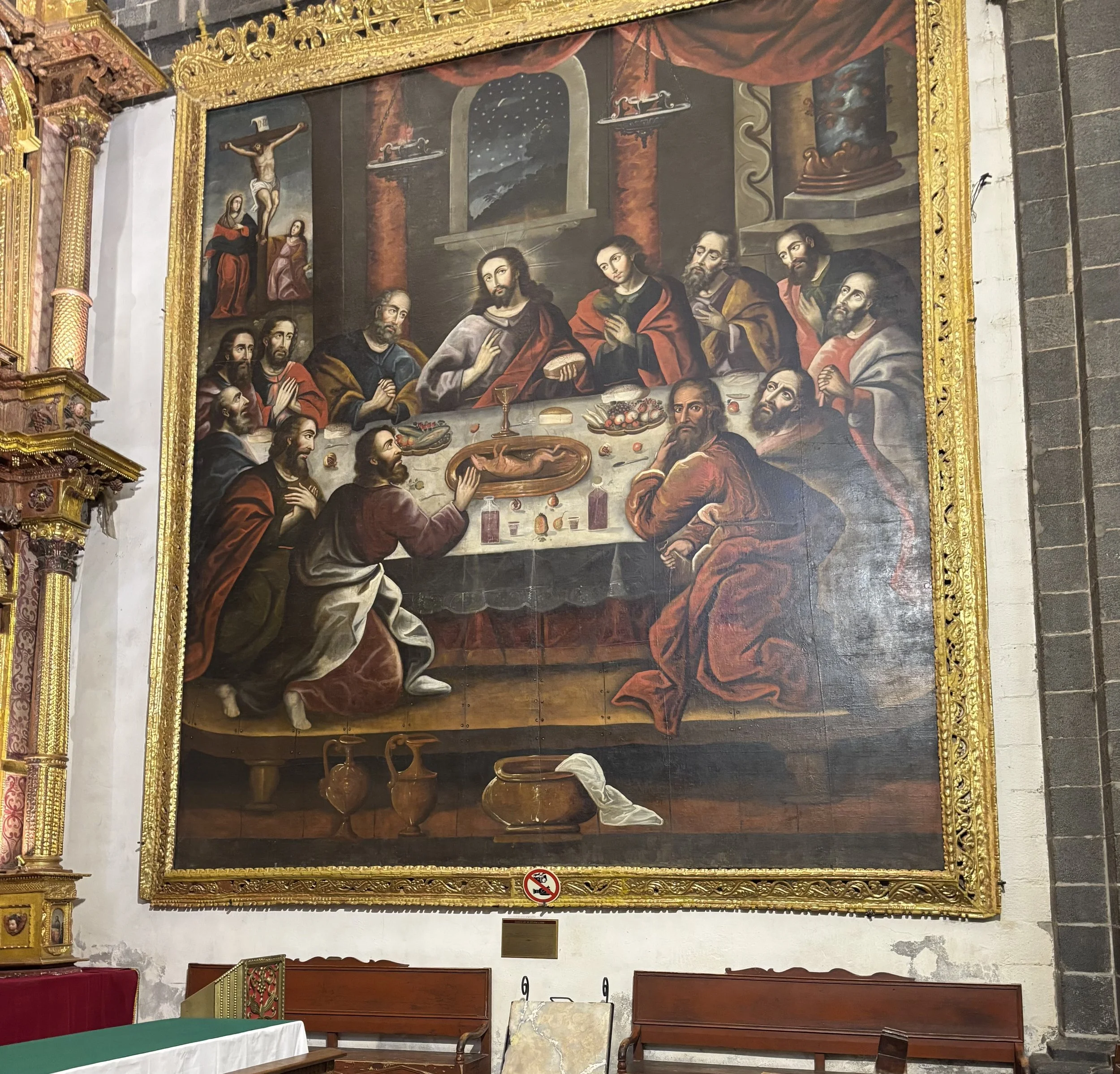 Oink and meow are pretty commonly understood to be good examples of onomatopoeia, but a lesser known one is “goy.” When we were exploring churches in Cusco, there were two things I really wanted to see: the Peruvian painting of the Last Supper and the Black Jesus. Both were in the same church and although photography was discouraged I was able to get a picture of the Peruvian Last Supper (scroll down).